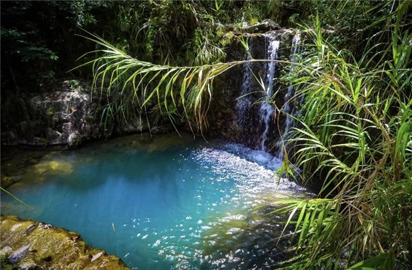 清澈見底的潭水,在陽光下折射出五顏六色的光。潭底深淺不一,潭水泛著不同層次的碧綠,懸潭四周高崖圍合,猶如置身于一個葫蘆中,潭水如同鑲嵌在其中的一顆巨大的翡翠。