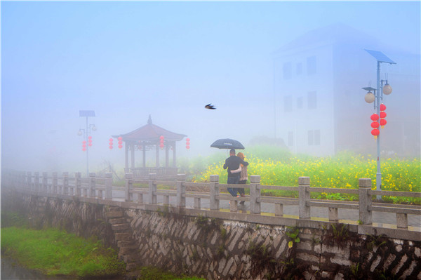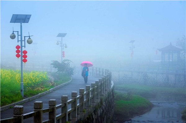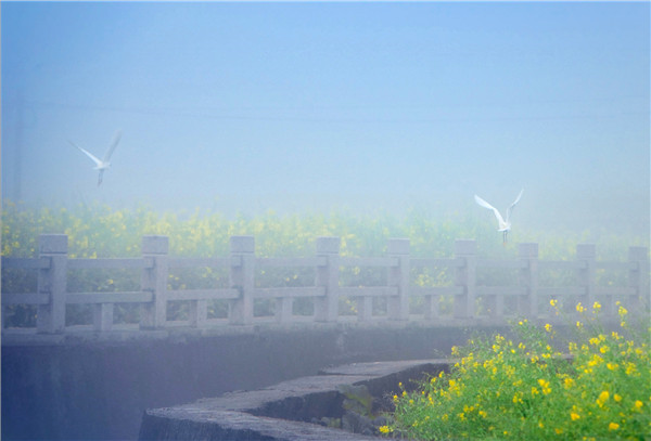春分前后,福建省泉州市洛江區(qū)虹山鄉(xiāng)的二百多畝油菜花田煙霧繚繞,鳥兒飛飛催早耕,村民忙著刨田灌水,古厝、木亭、溝渠若隱若現(xiàn),勾勒出一幅宛如仙境的畫面。