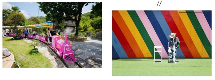 鄉(xiāng)韻鹿境是福建省首家梅花鹿親子主題樂園。看到奈良小鹿,大家忍不住要上前投喂一把。坐上小火車穿越度假區(qū),體驗(yàn)帳篷下午茶、親子游樂項(xiàng)目、萌寵樂園……這里處處都是網(wǎng)紅打卡點(diǎn)。達(dá)人“熊修修bear”擺著酷酷的姿勢(shì),在彩虹墻前留影。