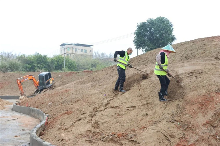 日前,筆者來到雙陽街道南山社區(qū)街頭綠地施工現(xiàn)場,只見工作人員正進(jìn)行土坡平整、樹穴開挖等綠化整理工程。