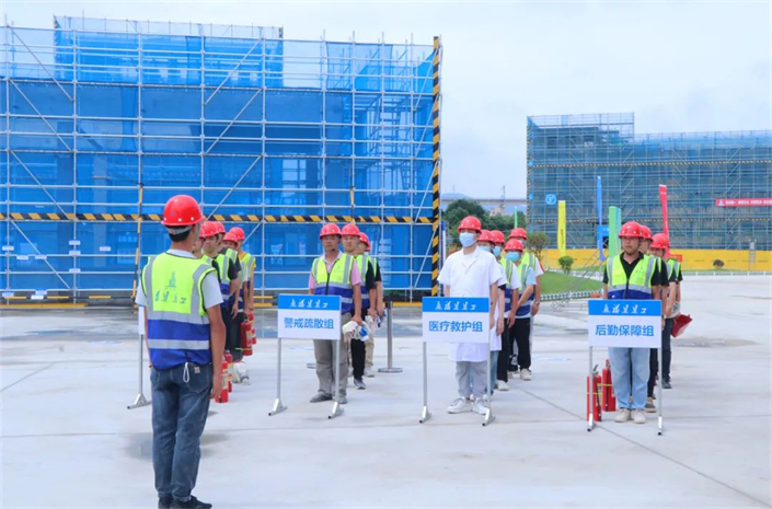 現場還組織消防應急救援實操演練,模擬施工現場用電不規范導致火災。事故發生后,工地迅速啟動消防應急預案,施工單位組建應急救援小組迅速反應,并第一時間請求消防及救護援助。隨后,消防應急車輛和救援隊伍也趕赴現場進行滅火和救援工作。演練過程中,各崗位人員反應迅速,協同配合,疏散過程安全有序。