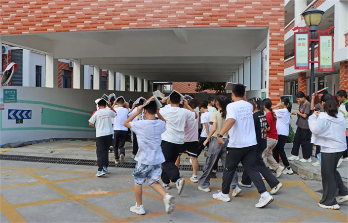 防空警報試鳴分為預(yù)先警報,空襲警報和解除警報三個階段。在泉州第十一中學(xué)人口疏散演練活動現(xiàn)場,1000余名師生在預(yù)先警報響起后迅速進(jìn)入應(yīng)急狀態(tài)。各班學(xué)生在老師的引導(dǎo)下,按照人口疏散路線快速有序地撤離教學(xué)樓。