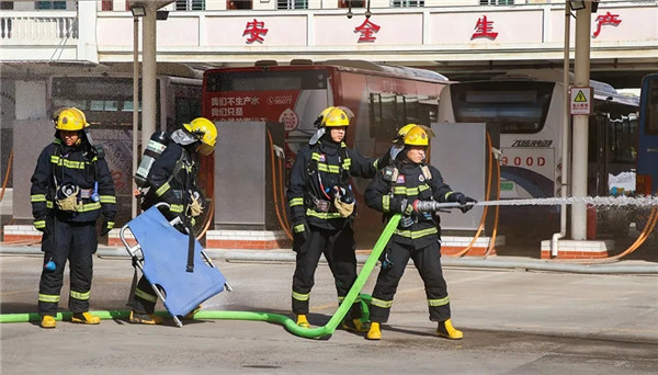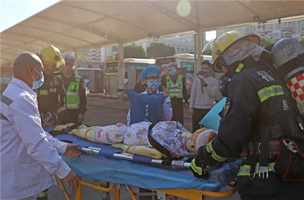 現場模擬了載有乘客的公交車自燃引發的交通事故。隨著刺耳的火情警報聲響起,只見車輛周圍濃煙滾滾,公交公司值班人員迅速報警請求救援。